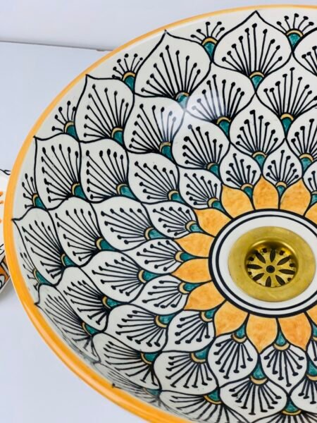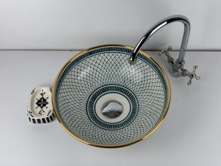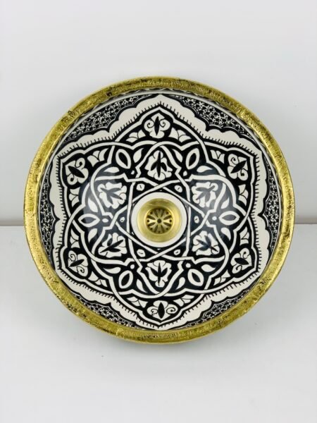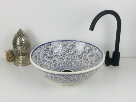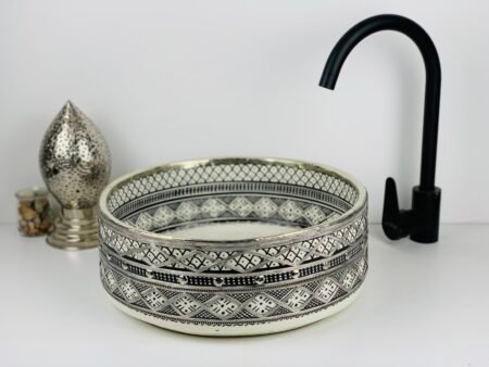 €90.00 – €330.00Price range: €90.00 through €330.00This is a beautiful, handcrafted vessel sink with a distinctive Moroccan flair. The sink features a bold black and white wave or fan pattern that covers both the interior and exterior of the bowl. The exterior is further embellished with a detailed silver filigree design and small, studded accents, giving […]